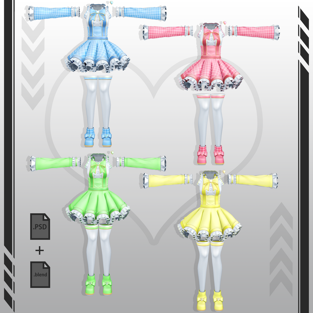3D model data (FBX and .Blend), texture data (.PNG and .PSD), and VRChat ready prefabs (.unitypackage) of these idol outfits for Eimear & Psy!