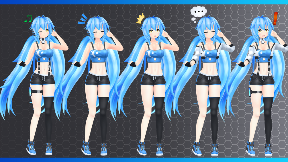 -7 premade emote animations are included with 4 of them set up to be used in the prefabs. The model comes with a custom blinking animator that does not interfere with emotion animations. Please read the blinking animator readme for information on how it works with the emotion animations.